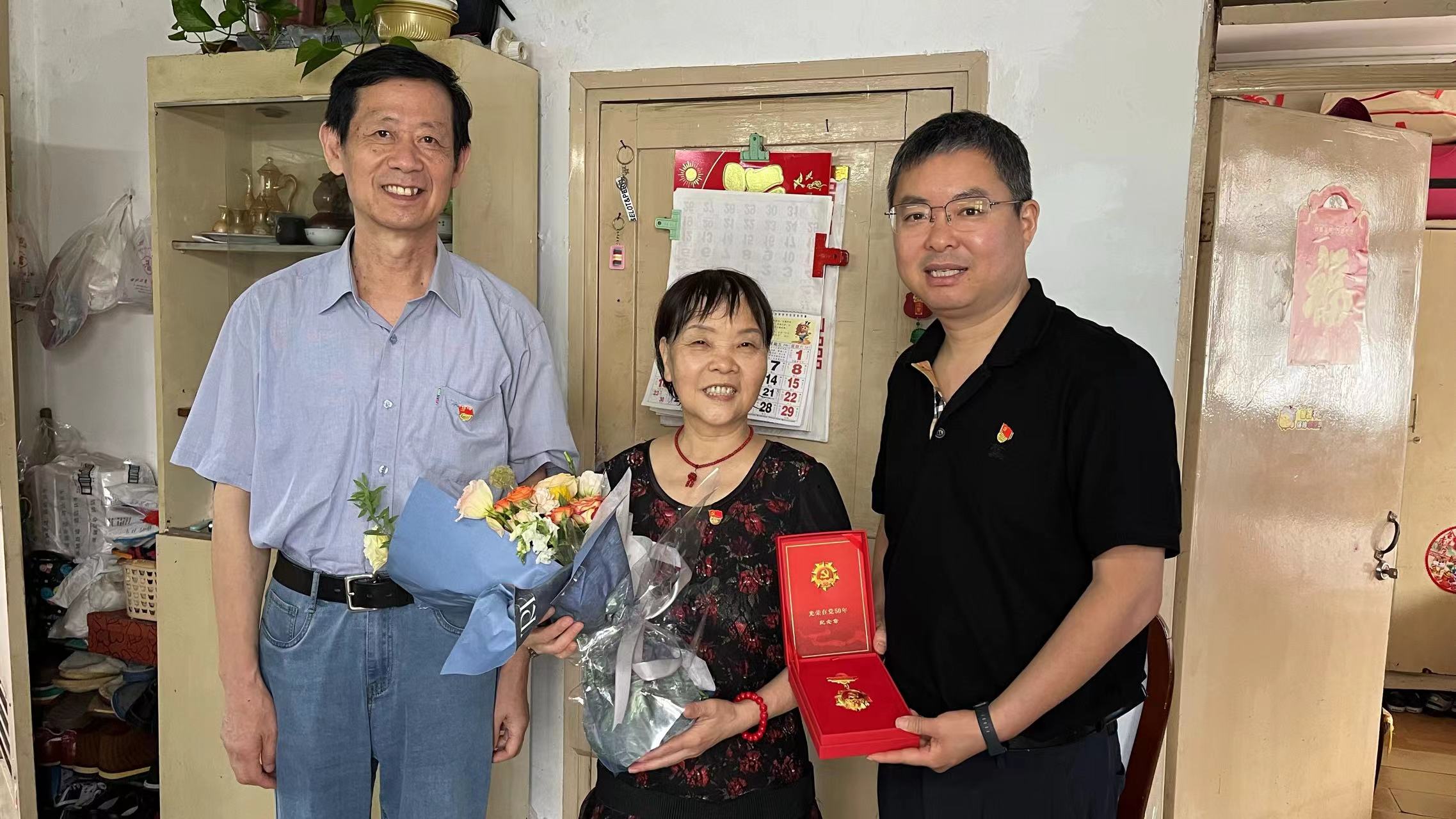 会后,肖甫青和左保齐来到退休老教师彭桃芝家中,为她送上2024年度“光荣在党50年”纪念章,肖甫青和彭老师拉家常,仔细询问她的身体、生活以及家庭近况,倾听她的想法,送上学院党委的温暖与关怀。