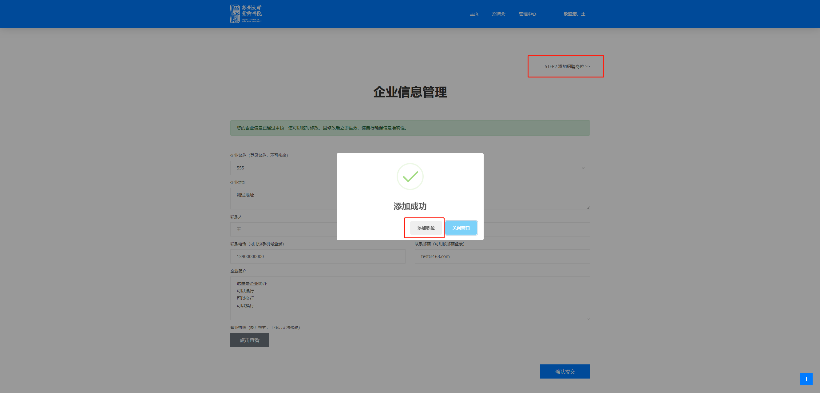 添加完成后,可以点击提示框的“申请招聘会”按钮,或者页面右上端的“STEP3申请招聘会”前往申请招聘会。