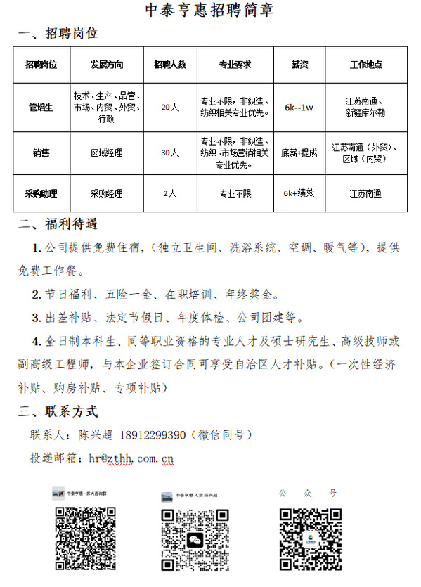 【招聘信息】新疆中泰亨惠医疗卫材股份有限公司