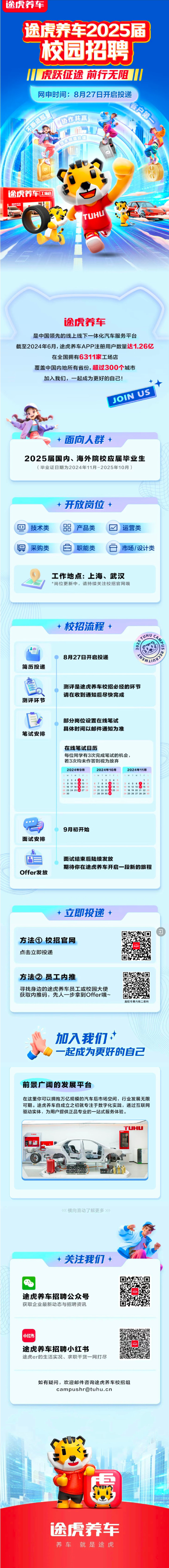 【关于我们】:途虎养车是汽车后市场行业规模第一的企业,于2023年正式在香港联合交易所主板挂牌上市,同年入选“中国互联网综合实力百强企业”。平台聚集了车主、供应商、汽车服务门店和其他参与者,是中国汽车服务商聚集的最大车主社区。