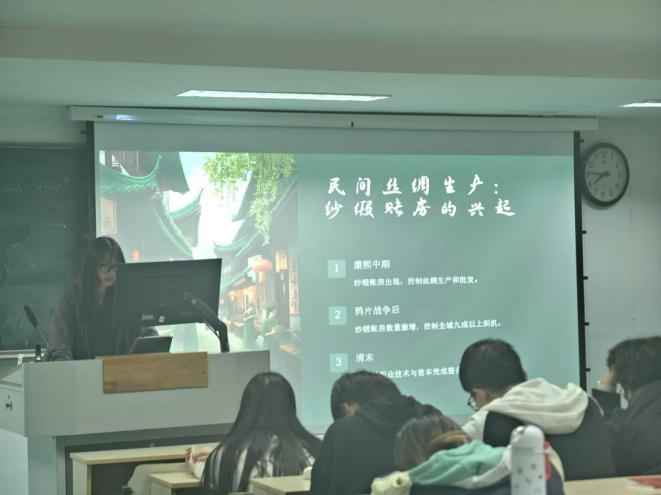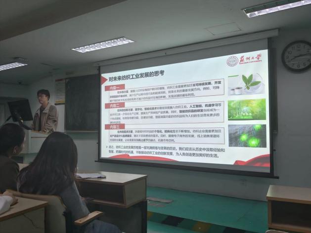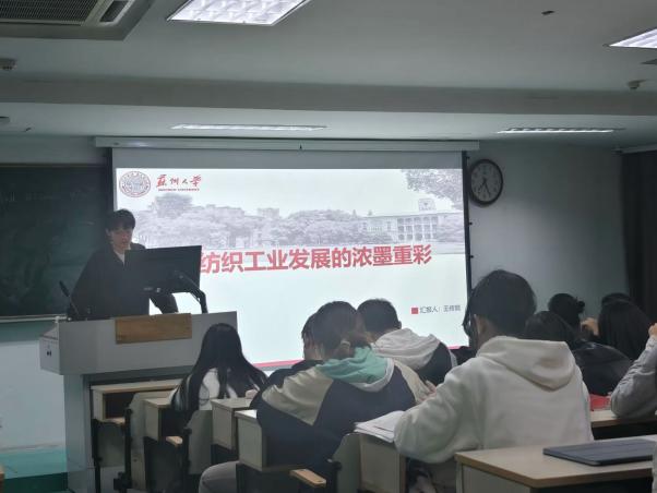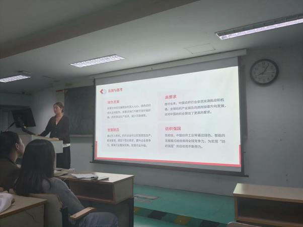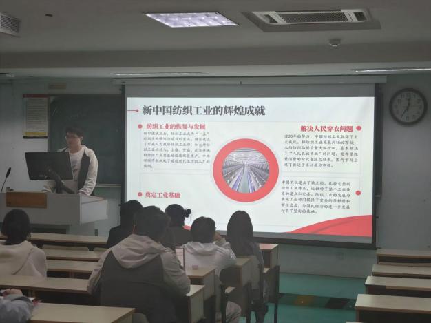 会上,学院党委副书记、副院长虞岚强调了作为新时代青年的责任和使命,并向同学们提出了要求:带着对党的忠诚和信仰去学习党的知识,坚持知行合一。王甜甜、尤柯琪、秦嘉、王传巽等11名同学上台分享了读书心得体会。从《织造救时:中国近代纺织史研究》到《中国近代纺织史》,再到《中国纺织通史》,同学们回忆了古代中国纺织技术的领先地位、近代以来中国纺织工业遭受的冲击和转型尝试,再到21世纪纺织工业向智能化、绿色化、高端化转型的历程。纺织工业的发展,反映新中国成立以来经济社会的巨大变迁,包括人民生活水平的提高、城市化进程加速等。同学们不仅探讨了纺织工业的继承与创新,还深入分析了在新时代下遇到的挑战与机遇。工匠精神、循环经济、未来规划等话题,也成为了大家热议的焦点。