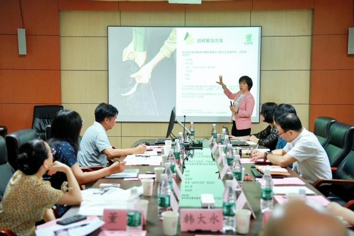 胡蓉晖详细介绍了企业历史沿革、发展定位及公司业务优势,随后与会人员围绕产学研深度融合与人才培养展开热烈讨论。双方就环保新材料研发、传统工艺替代、生物基产品应用、分析检测及标准制定等议题交换意见。陆晓峰就人才需求和合作方向作了展望。