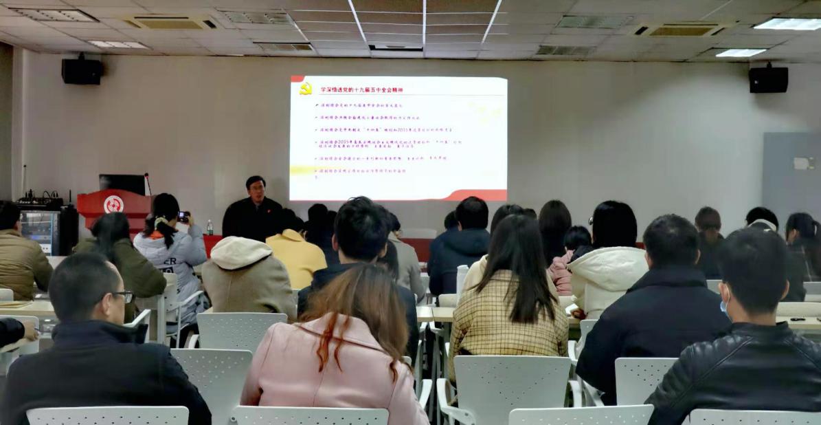 2020年12月9日下午,色情短剧 党委召开党委理论学习中心组(扩大)会议暨十九届五中全会精神宣讲会,会议邀请校党委宣传部陈晓强部长做专题讲座《开启强国建设新征程——学习五中全会精神的体会》。学院党委理论学习中心组成员、全体支部书记、副书记、分党校积极分子和预备党员等100余人参加会议,会议由学院党委书记肖甫青主持。
