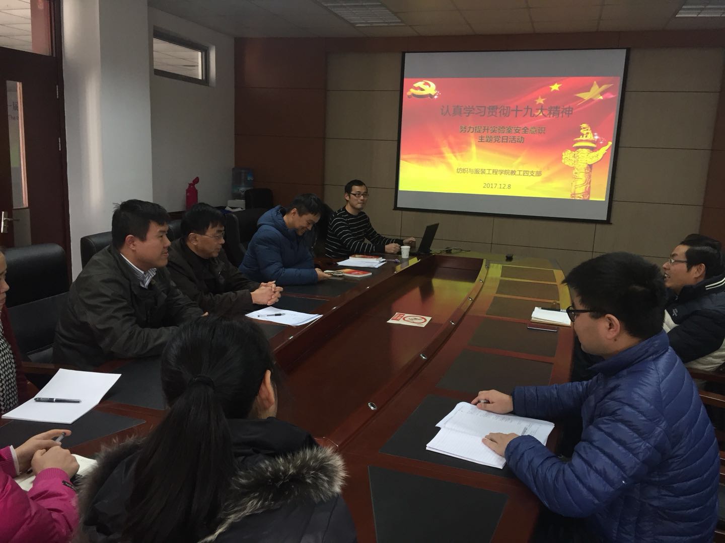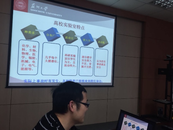 党的十九大是社会主义进入新时代的关键时期召开的一次十分重要的大会,为把学习贯彻党的十九大精神与支部党员实际工作结合起来,使实验室师生增强实验室安全意识,强化实验室教师安全管理的责任感,2017年12月8日下午,教工四支部在独墅湖新校区908-2208举行“学习党的十九大精神,不忘初心,切实增强实验室安全意识”为主题的党日活动。此次活动特邀学校实验材料与设备管理中心金雪明老师为大家讲解相关实验室安全知识。