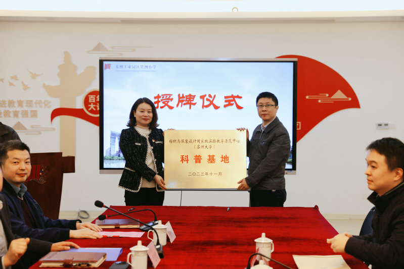 纺织与服装设计国家级实验教学示范中心科普基地揭牌仪式在苏州市星洲小学举行。11月10日上午,星洲小学党委书记王晓琳、校长卢志敏、副校长唐洁、学院副院长陈廷教授、总实验室主任祁宁、院学生工作办公室主任季彦斐,共同参加揭牌仪式。
