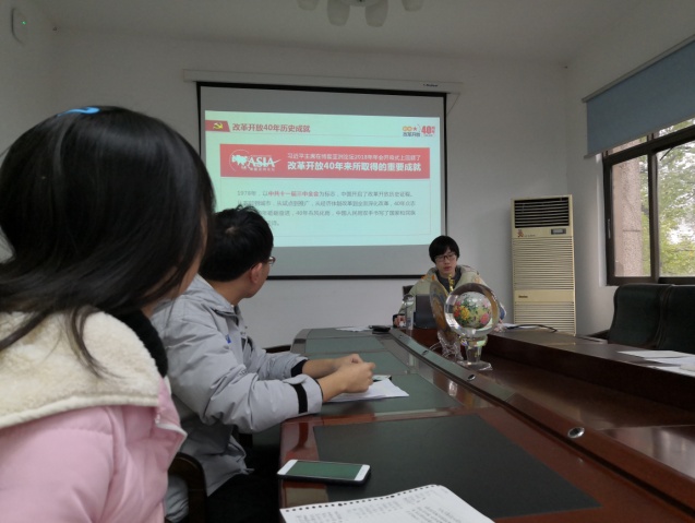 首先,大家观看了习近平总书记关于改革开放四十周年的讲话视频,在讲话中,习近平总书记指出:改革开放极大改变了中国的面貌、中华民族的面貌、中国人民的面貌、中国共产党的面貌。中华民族迎来了从站起来、富起来到强起来的伟大飞跃!中国特色社会主义迎来了从创立、发展到完善的伟大飞跃!中国人民迎来了从温饱不足到小康富裕的伟大飞跃!中华民族正以崭新姿态屹立于世界的东方!通过习近平总书记的讲话,大家认识到,党的十一届三中全会以来党团结带领全国各族人民开辟的中国特色社会主义道路、理论、制度、文化是完全正确的,形成的党的基本理论、基本路线、基本方略是完全正确的,改革开放对中国发展具有重大理论和现实意义。