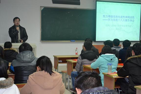 党支部在工科楼303举行了主题为“贯彻落实十八大,校园先锋勇争先”的党会。会议共分为三个部分:优秀学生党员董青、赵楚楚同学汇报党支部对《学生党员先锋模范目标管理责任书》的允诺兑现情况;新发展党员、新生党员《学生党员先锋模范目标管理责任书》承诺、落实说明会;学院党委书记孙庆民给学生党员上党课。院党委书记孙庆民,党委副书记、副院长王成奎,团委副书记马书明,团委老师刘海和全体本科生党员参加了此次党会。会议由马书明主持。
