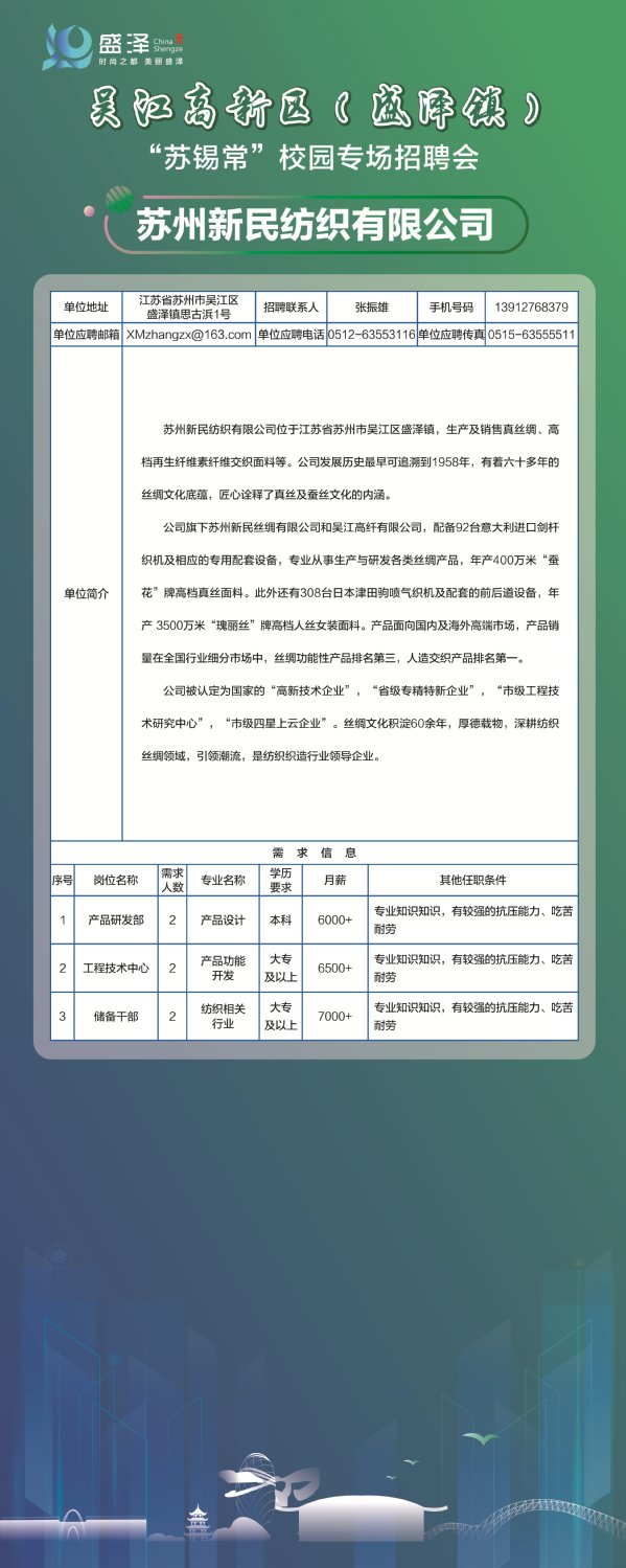 【招聘信息】苏州新民纺织有限公司