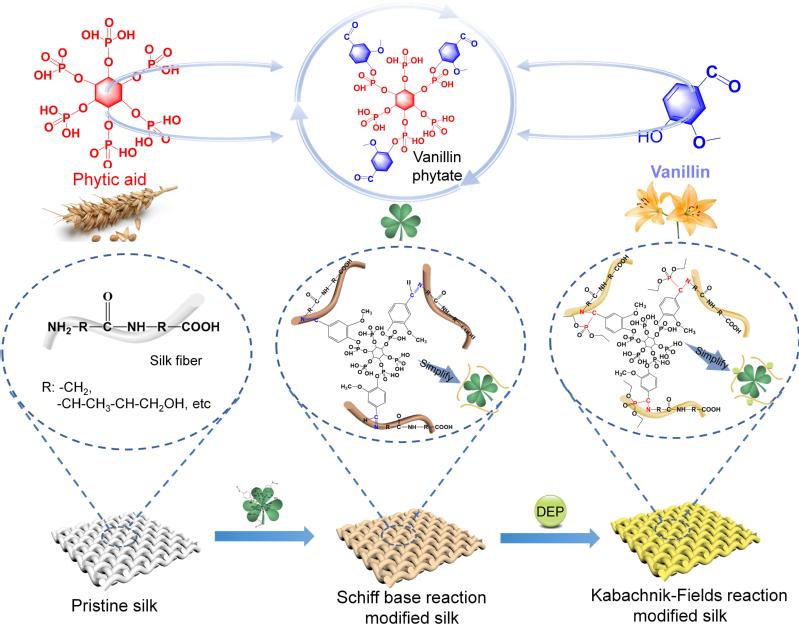The development of sustainable and durable flame-retardant protein silk fabric without compromising its physical properties is of interest but challenging. In this study, a fully biobased reactive flame-retardant, vanillin phytate, was synthesized from biomass phytic acid and vanillin. Subsequently, vanillin phytate was covalently grafted onto silk fabrics along with diethyl phosphite under mild conditions via the Kabachnik–Fields reaction. The chemical structure of vanillin phytate and its potential cross-linking mechanism with silk fibers, thermal stability, combustion behavior, flame retardancy, washing durability, and mode of action of the modified silk fabrics were investigated. The modified silk exhibited a significant reduction in heat and smoke release by 63.8% and 90%, respectively, versus pristine silk. The modified silk fabrics also demonstrated excellent self-extinguishing capacity, with a reduced damaged length of 7.0 cm and an increased limiting oxygen index of over 34%. Furthermore, the modified silk fabric maintained self-extinguishing performance after 25 washing cycles, showing high flame-retardant efficiency and good washing durability. The char residue analyses revealed that the modification primarily exerted its flame-retardant effect in the condensed phase. Interestingly, the present strategy had less influence on the physical performance of silk fabrics, indicating a wide range of practical applications.