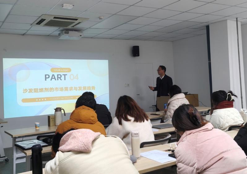 在此次讲座中,董朝飞工程师系统地介绍了市场上沙发用阻燃剂的主要类别、常见的加工技术以及不同国家的阻燃测试标准,并对未来沙发用阻燃剂的发展趋势进行了展望。他的报告不仅涵盖了当前的技术现状,还对行业未来的发展方向提出了独到见解。