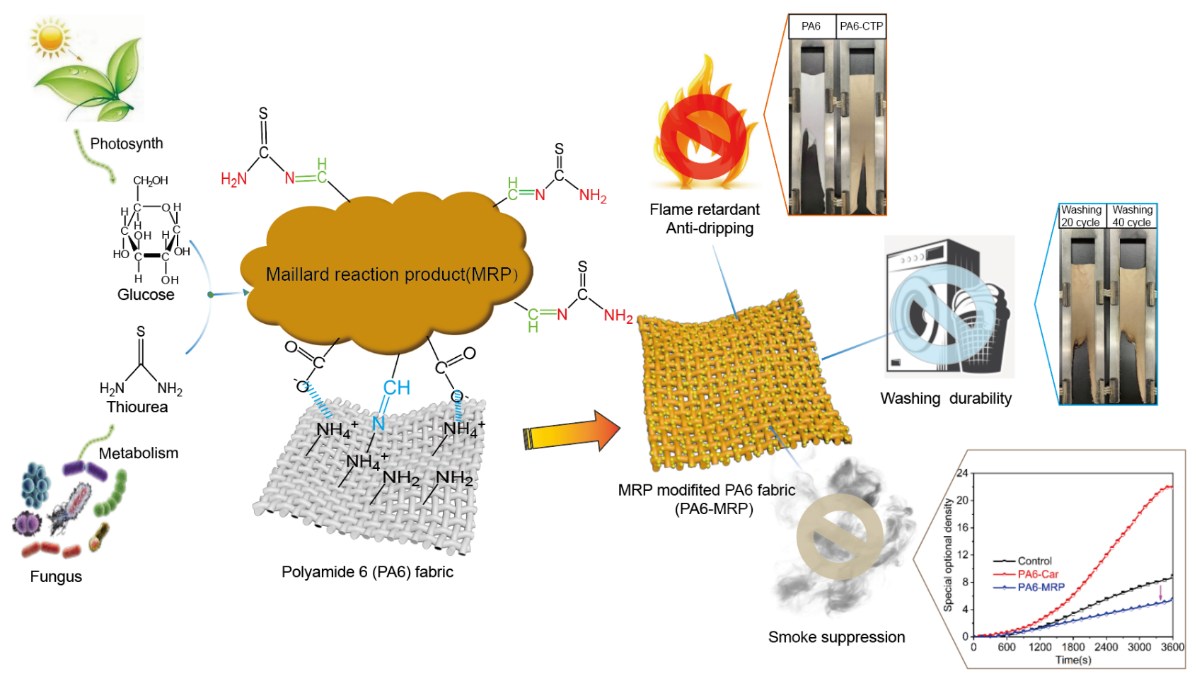 小分子还原糖如葡萄糖和含氨基硫脲阻燃剂在热碱加热过程中能够发生羰醛缩合合成美拉德产物,该类产物具有较高的黏附性。大分子中含硫阻燃剂中含有活性醛基和羧基,可与锦纶6织物上的氨基产生共价键交联和离子键结合。图示为生物质大分子含硫阻燃剂的合成路线及其对高强锦纶6织物的阻燃整理流程图。