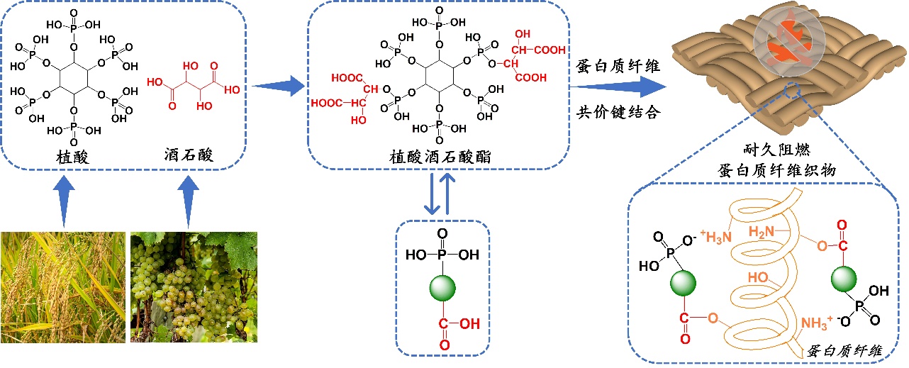 植酸是植物中磷元素的主要储存形态,分子中磷含量高(28 wt%),具备较强催化成炭能力,是构筑高效环保阻燃体系的理想选择之一。在分子结构上,植酸含有6个磷酸根基团,可借助与阳离子化合物如壳聚糖、聚乙烯亚胺、阳离子硅溶胶等的静电引力作用,通过层层自组装技术制备阻燃涂层以提高纺织品的阻燃性能。层层自组装技术具有适用性强、绿色环保等特点,但该技术涉及多次组装流程在织物表面沉积足量阻燃剂使织物获得较好的阻燃性能,涂层耐水洗性能差,且工艺流程繁杂,对织物的物理性能损伤较大。目前,众多植酸基阻燃体系被用于提高纺织品的阻燃性能,但阻燃纺织品的实施方案和应用性能仍需进一步改善。构建高效的植酸基阻燃体系,用于制备耐久阻燃蛋白质纤维织物,并保持织物原有的优良品质极为重要。