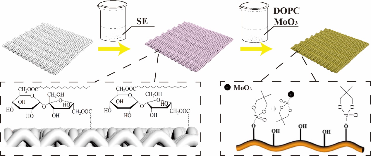 因此,本研究采用三氧化磷和新戊二醇制备DOPC(磷酰氯),并采用合成的阻燃剂和三氧化钼制备阻燃低烟再生聚酯。蔗糖脂肪酸酯具有双亲性结构,在高温高压下,其疏水链段会进入聚酯织物内部,而亲水链段保留在织物表面。其亲水链段可与DOPC进行反应;同时DOPC与三氧化钼表面的羟基反应后通过分子作用力会粘附于和织物上羟基已经反应后的DOPC,使得三氧化钼能被DOPC牢牢包裹并附着于聚酯织物表面。图示为阻燃防熔滴抑烟再生聚酯织物的制备流程图。