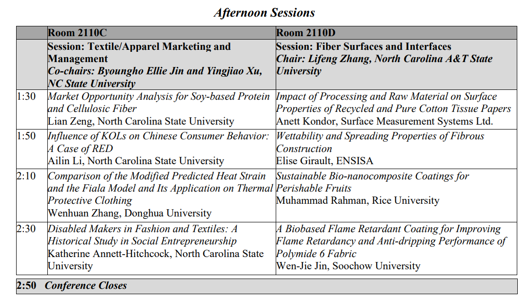 本次会议是第80届会议,由北卡罗莱纳州立大学威尔逊纺织学院主办,来自全球纺织类院校的近百名研究人员通过线上或线下的方式参加了会议。此次会议主题为“80 Years of Excellence in Advancing Scientific Knowledge Pertaining to Fibers and Fiber Materials”,会期为20日至22日,分14个分会场,就纤维在医疗卫生方面的应用、纤维复合材料、纤维的测试与表征、智能纺织品等领域的问题进行了深入探讨与研究。此次会议上全球纤维和纺织领域相关专家的参与,多样化的科学研究、高质量的学术论文给参会人员留下了深刻印象,可谓是纺织领域前沿科学研究的一场饕餮盛宴。