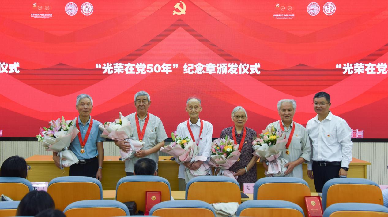 会议在庄严的国歌中拉开序幕。我院“光荣在党50年”纪念章获得者共10位,当天出席会议的5位,分别是党龄51年的黄水慕、党龄54年的彭文彬和张根生、党龄59年的乔琴媛、党龄61年的朱洪欣,学院党委书记肖甫青为老党员们一一颁发纪念章、赠送鲜花,并致以最崇高的敬意。
